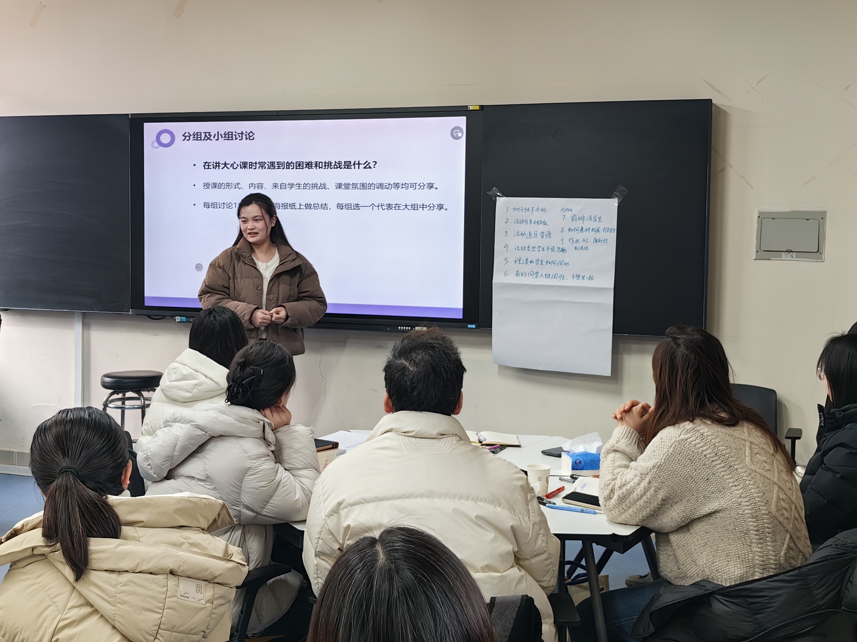 上午的培训主题为《从讲授到体验——如何打造体验式心理大课堂》。主讲夏老师从积极心理学视角出发,系统阐释了体验式教学的理念框架、设计逻辑与实施路径,重点讲解了互动活动组织、视频素材运用、大课堂氛围调动等实用技能。在分组研讨环节,参训教师围绕“当前教学面临的主要困难与挑战”展开交流,就如何提升学生参与度、平衡理论讲授与课堂互动、改善大班教学效果等共性话题分享了各自的做法与思考。夏老师结合教师提出的问题,现场播放影视片段《分手男女》,示范如何借助视频材料引导学生分析情感冲突、展开深度讨论,为参训教师提供了生动直观的教学范例。