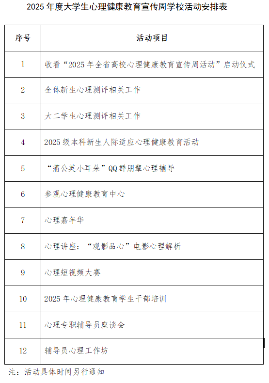 附件:2025年度大学生心理健康教育宣传周学校活动安排表